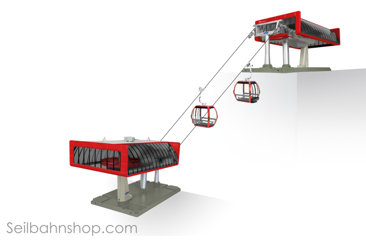 Die in der Packung erhaltene Zwischenstütze ist steckbar ausgeführt und kann von 15cm höhe auf 46cm höhe gebracht werden. Hierzu finden sich zwei Zwischenstücke in der Packung. Der Stützenkopf trägt ein Doppelmayr Logo sowie die beiden 4er Rollenbatterien. Die Rollenbatterien sind, gleich wie bei den Stationen, beweglich ausgeführt und können als Trag- oder Niederhaltebatterie eingesetzt werden. In der Grundplatte der Stütze befinden sich vier Bohrungen, durch welche sich die Stütze auf den Untergrund schrauben lässt.